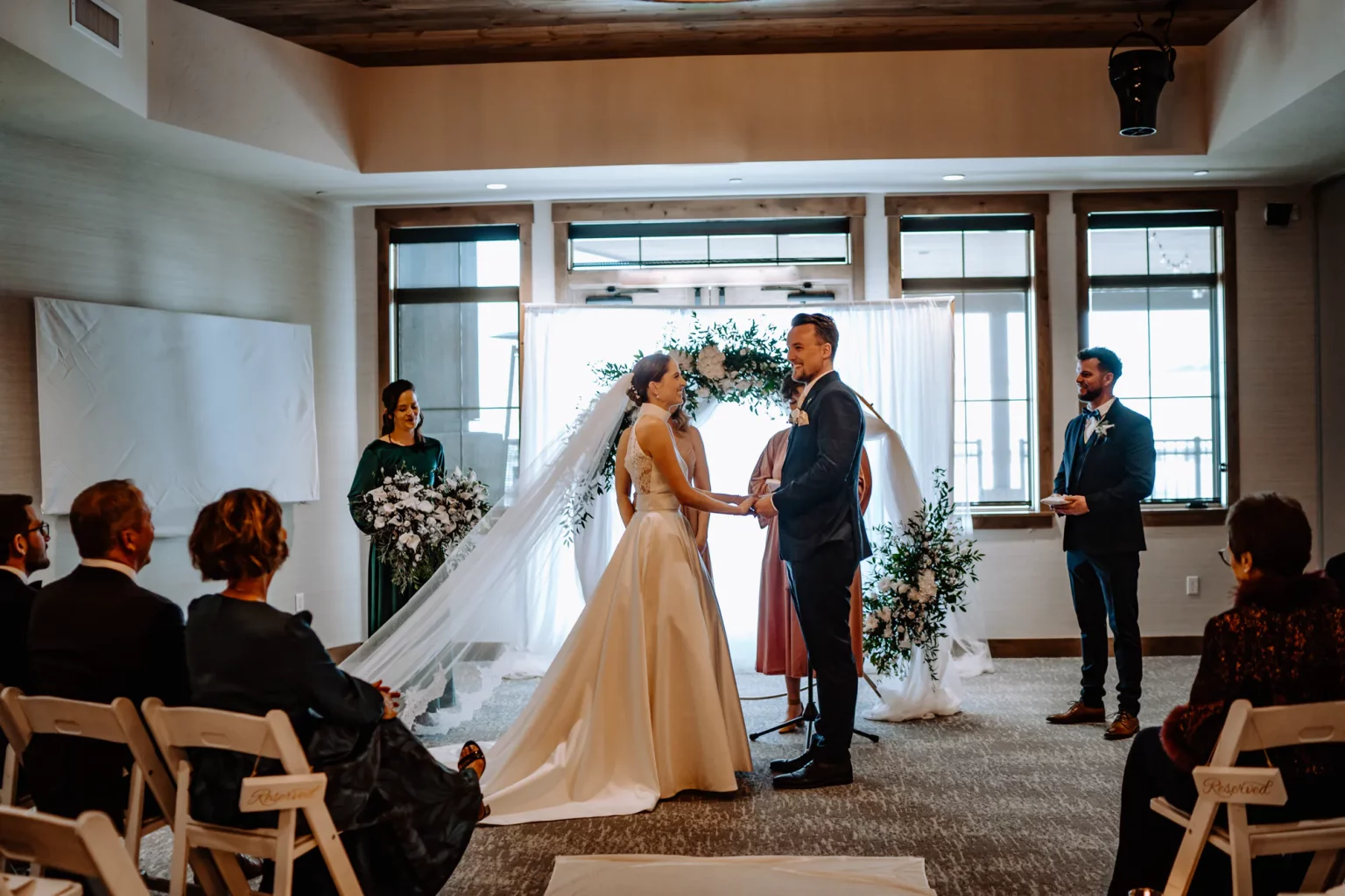 Gleich danach durften wir Teil einer sehr emotionalen freien Trauung werden, die von den beiden Schwestern des Brautpaares gehalten wurde. Es hätte nicht schöner sein können. Der Nachmittag wurde ganz klassisch mit einem Sektempfang und einigen Familienfotos gestaltet. Und ich wollte nochmal kurz erwähnen, dass wir ein so Riesenglück mit dem Wetter hatten. In der Gegend ist es normalerweise zu der Jahreszeit sehr kalt und unglaublich schneereich. An diesem Wochenende war es tagsüber mit um die null Grad aber recht warm, und die Sonne hat den Tag einfach perfekt gemacht.